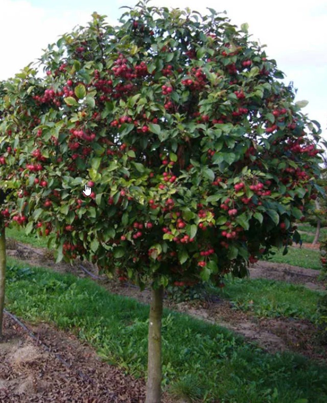 Штамбовая яблоня Роял Бьюти (Royal Beauty) представляет собой компактное дерево с ниспадающими ветвями, на которых образуются привлекательные плоды, напоминающие ягоды. Это растение сохраняет декоративный вид с ранней весны до поздней осени. Красные плоды не предназначены для употребления в пищу, но они привлекают птиц. Деревья этого сорта идеально подходят для создания аллей, украшения придомовых территорий и участков возле беседок или скамеек. Интенсивность окраски листвы зависит от уровня освещения. Для посадки рекомендуется использовать свежую почву с нейтральной или слегка кислой реакцией. Растение неприхотливо и не требует сложного ухода.